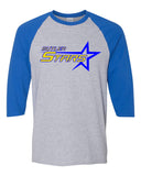 Butler Stars Gray/Royal Raglan Tee w/ Butler Stars Logo on Front.