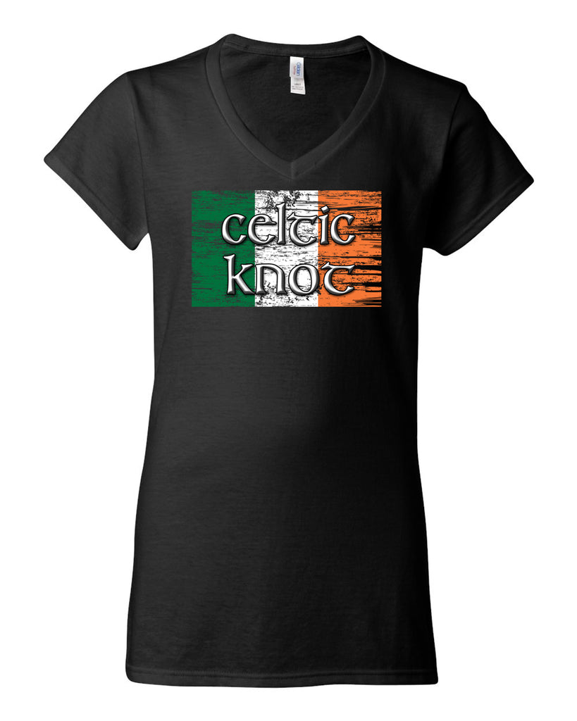 Celtic Knot Black Softstyle® Women’s V-Neck T-Shirt - 64V00L w/ Full Color FLAG Design on Front
