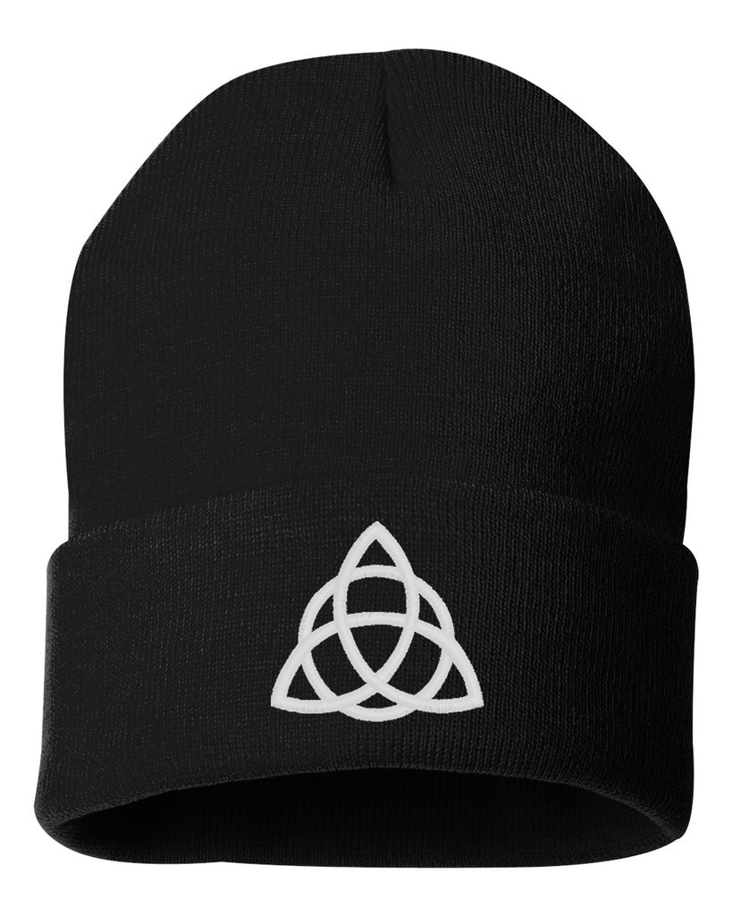 Celtic Knot Black Solid 12" Cuffed Beanie w/ White TRIQUETRA Design on Front