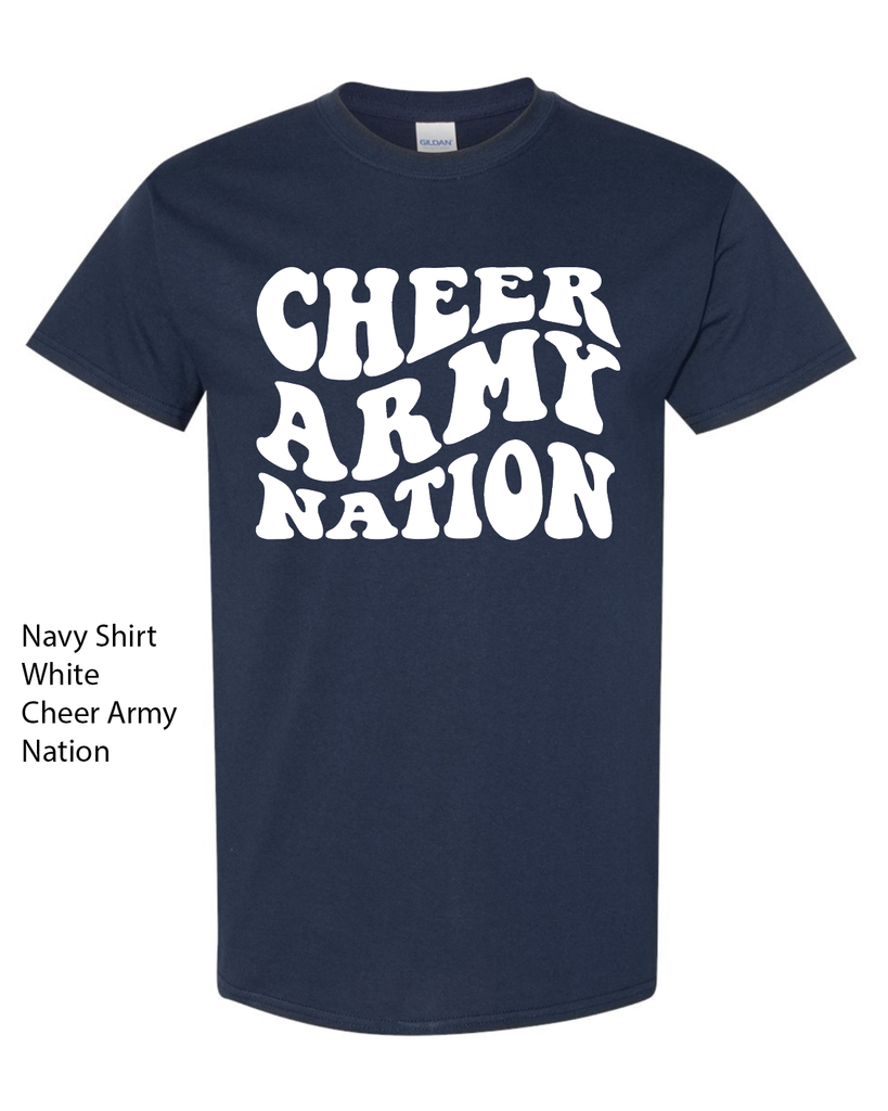 Cheer Army Navy Blue Short Sleeve Tee w/ CHEER ARMY NATION Wave Design on Front.