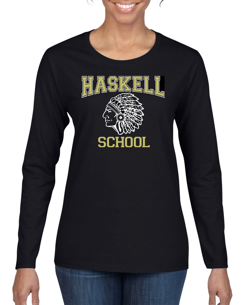HASKELL School Heavy Cotton Black Long Sleeve Tee w/ HASKELL School "Indian" Logo on Front.