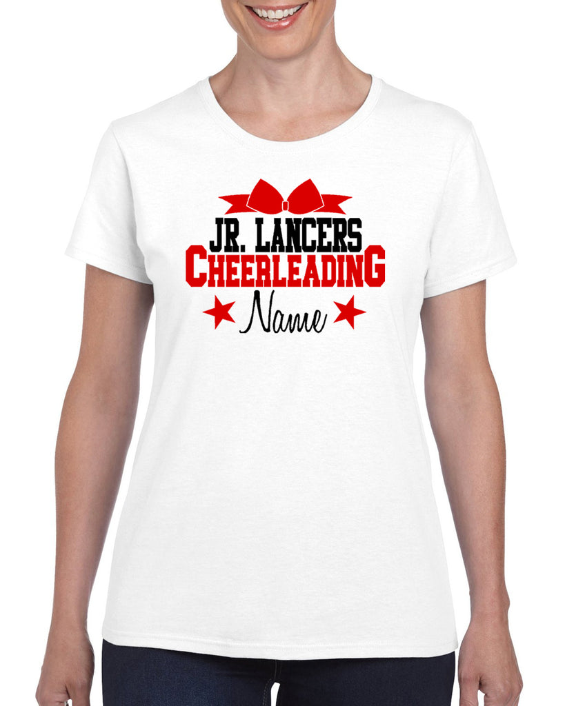 Jr Lancers Competition Cheer Heavy Cotton White Shirt w/ Cheerleading 2 Color Design on Front.