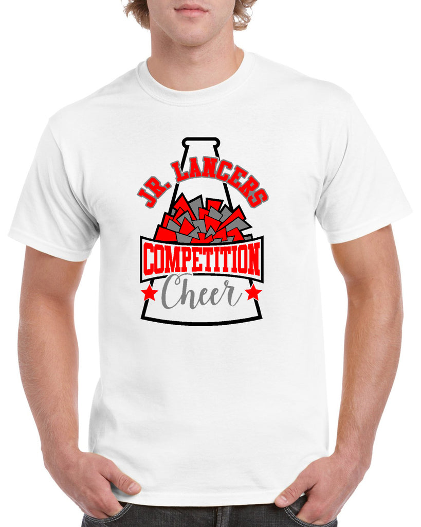 Jr Lancers Competition Cheer Heavy Cotton White Shirt w/ Megaphone 3 Color Design on Front.