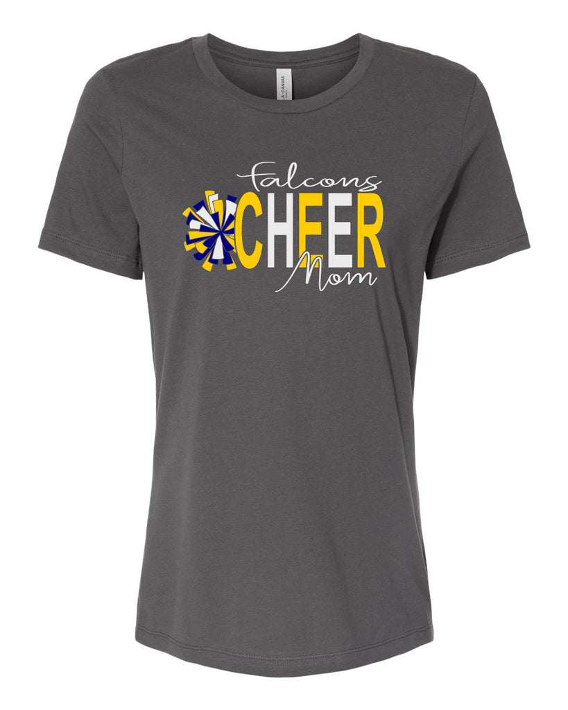 Jefferson Cheer Asphalt Women’s Relaxed Jersey Tee - 6400 w/ Pom Falcons Cheer MOM Design on Front.