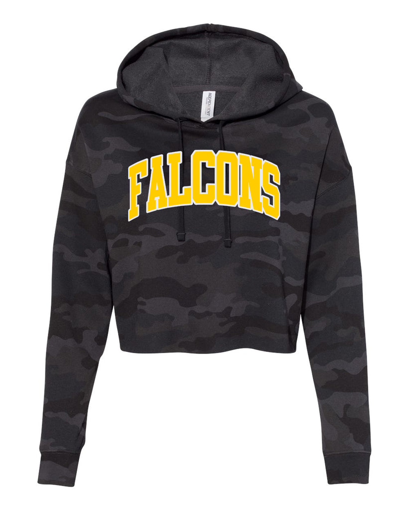Jefferson Cheer Black Camo Women’s Lightweight Crop Hooded Sweatshirt - AFX64CRP w/ Falcons Arc Design on Front.