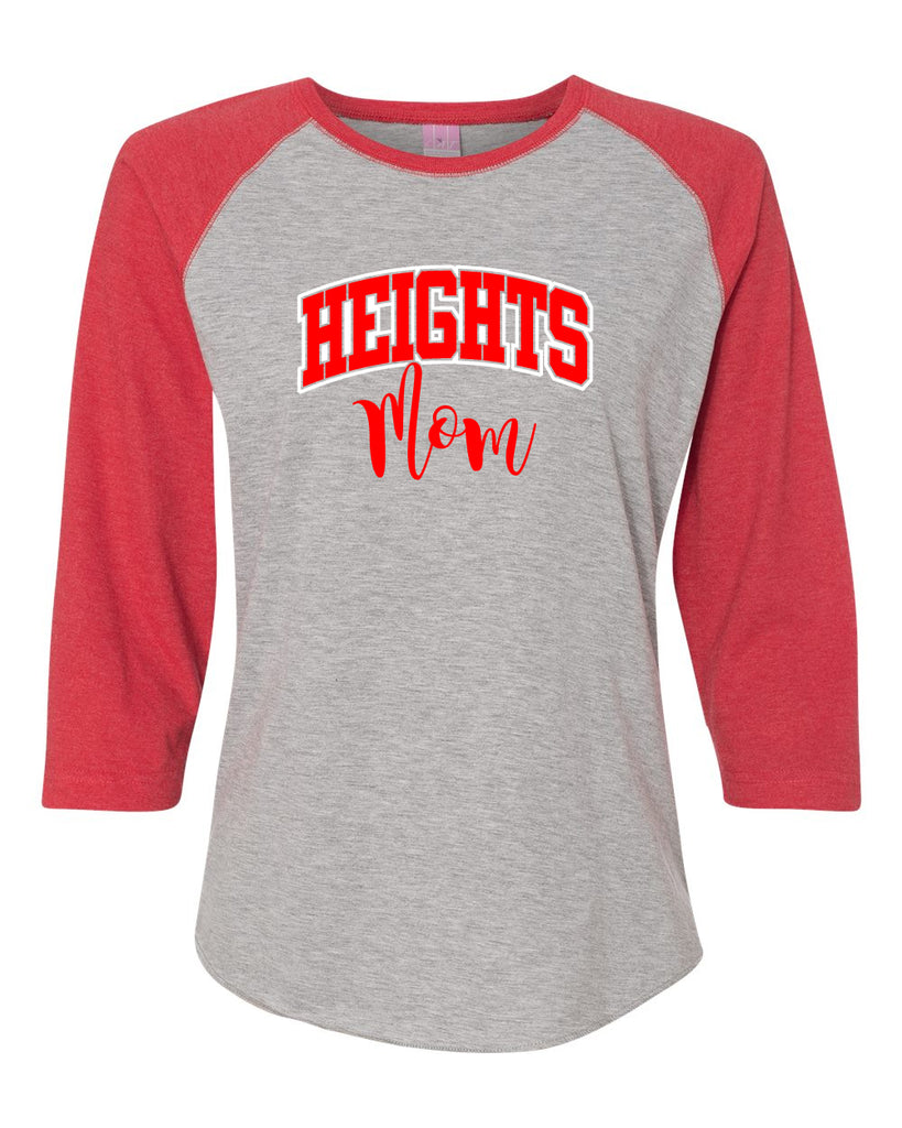 Heights LAT - Women's Baseball Fine Jersey Three-Quarter Sleeve Tee - 3530 Tee w/ Heights Mom in Red on Front.