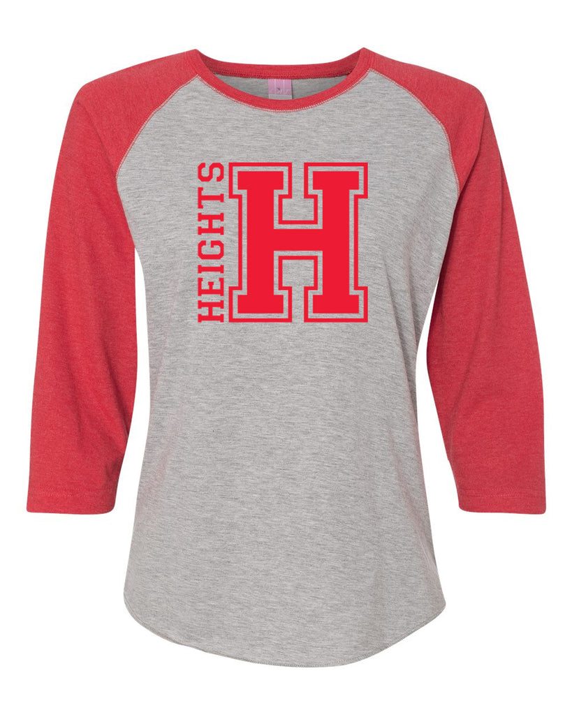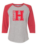 Heights LAT - Women's Baseball Fine Jersey Three-Quarter Sleeve Tee - 3530 Tee w/ Heights OG Design in Red on Front.