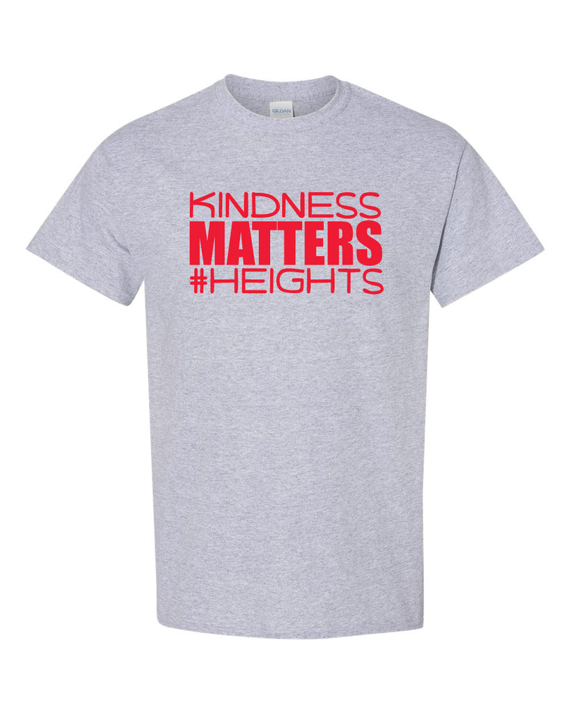 Heights Sport Gray Short Sleeve Tee w/ Kindness Matters Design in Red on Front.