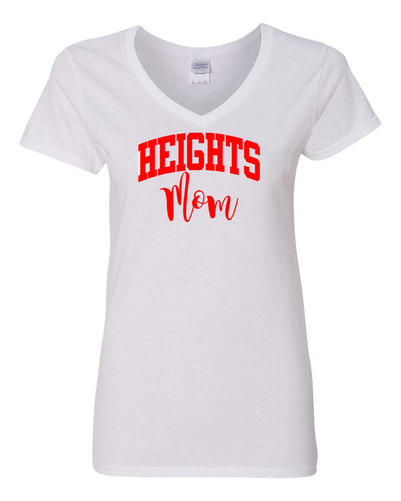 Heights White Short Sleeve Tee w/ HEIGHTS Mom Design in Red on Front.