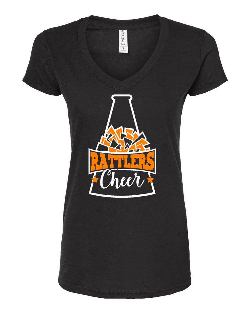Ringwood Rattlers Black Tultex - Women's Poly-Rich V-Neck T-Shirt - 244 w/ 2 Color Rattlers Cheer Megaphone Design on Front