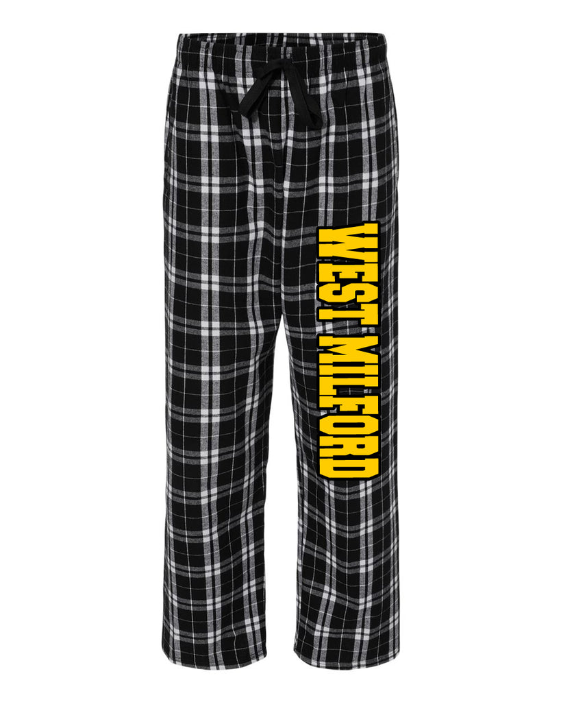West Milford Cheerleading - Black & White Flannel PJ Style Pants w/ West Milford Print down Leg.