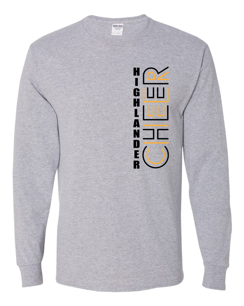 West Milford Cheerleading - Sport Gray Long Sleeve Tee w/ Highlander Cheer Vert Design on Front.