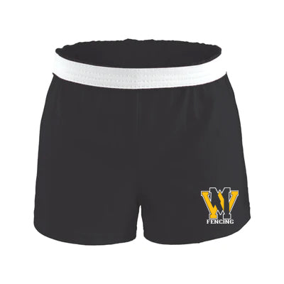 West Milford Fencing Black Authentic Low Rise Soffe Short w/ Gold & White Print WM Logo on Front Left Leg.