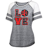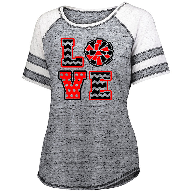 Jr Lancers Competition Cheer Advocate Striped Sleeve Shirt w/ 2 color Love Cheer Design on Front.